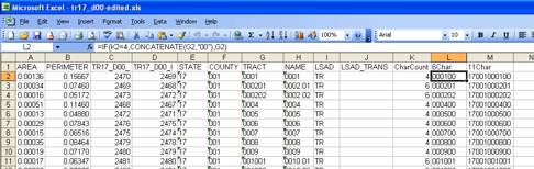 My goal is to join this new data with the attribute table for the tract shape file. But because the tract ID numbers are not formatted in the same manner, I have to modify the shape file’s table in Excel by creating new tract numbers that match the 11-digit numbers from the Census file. It’s a three step process. First, I have to distinguish 4 digit tracts from 6-digit tracts, so I create a length field. Second, I use an If/Then logic rule, along with the concatenate function, to add “00” to all the 4-digit tracts. Finally, I concatenate the three text strings (State code + County code + tract code) to create the same 11-digit code in the other Census data.