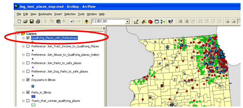 To retain the equidistant projection of the data frame, I re-export this layer’s data to create a new layer called “Qualifying Places with Preferences.”