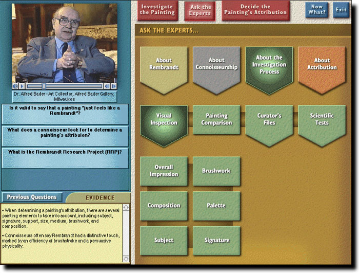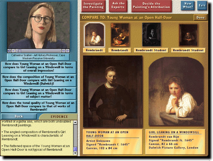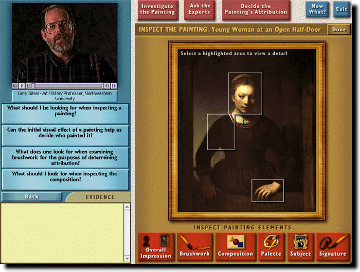 The "Is it a Rembrandt?" program, built in collaboration with Professor Larry Silver, formerly of Northwestern University's Art History Department, introduces art history students to these issues by having the student determine the authenticity of three Rembrandtesque paintings. By inspecting the painting, running laboratory tests, and asking art experts questions (via a video archive of over 450 clips), students gather evidence that they later use to argue for an attribution. Throughout this process students encounter the complex issues surrounding connoisseurship and attribution, and learn more about both painting in general and Rembrandt in particular.