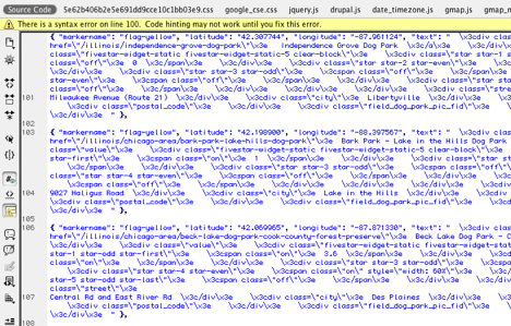 For my preference, “Near a dog park,” I obtain the data for dog parks from the Web site http://www.dogparkusa.com/. The Web site features a Google map for each state, with location place markers for each dog park. The data is not available for direct download, but it can be accessed by viewing the source HTML:
